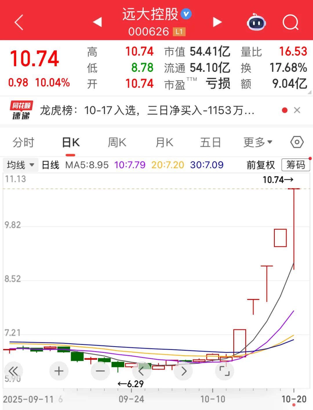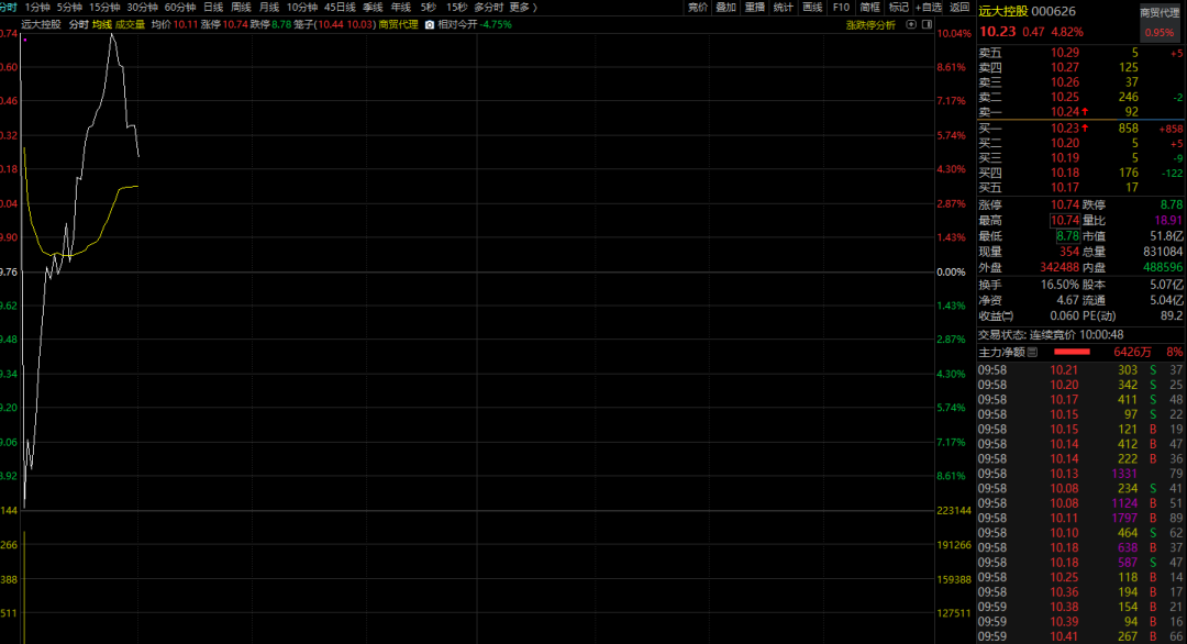 今日(10月20日)早盘,远大控股(000626)上演剧烈波动,集合竞价后以涨停板开盘,随后在1分钟内直线跳水,触及跌停板,上演“天地板”行情。