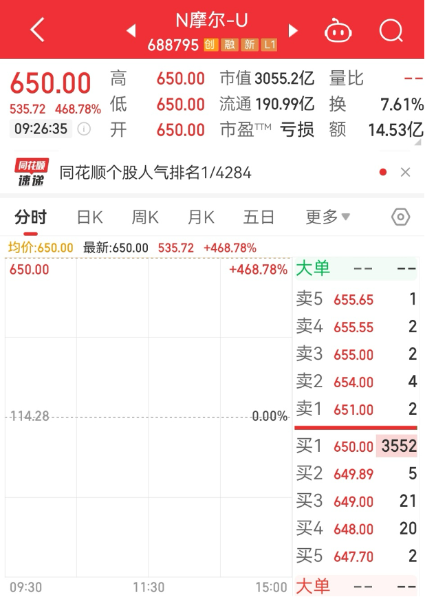 今日(12月5日),摩尔线程(688795)登陆科创板,发行价114.28元/股,为A股近一年来上市新股最高。该股开盘大涨468.8%,A股市值直接飙升至3000亿元以上。
