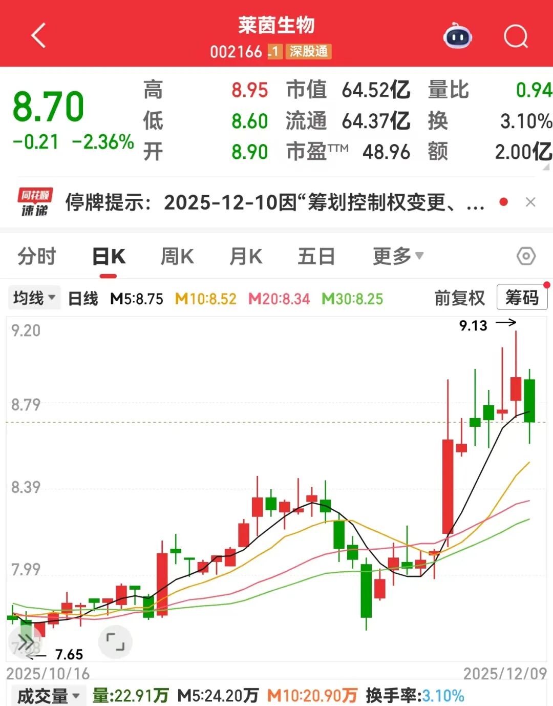 公司股票自2025年12月10日开市起停牌,预计停牌时间不超过10个交易日,控制权变更、发行股份及支付现金购买资产并募集配套资金事项目前处于筹划阶段,尚存在重大不确定性,敬请广大投资者注意投资风险。