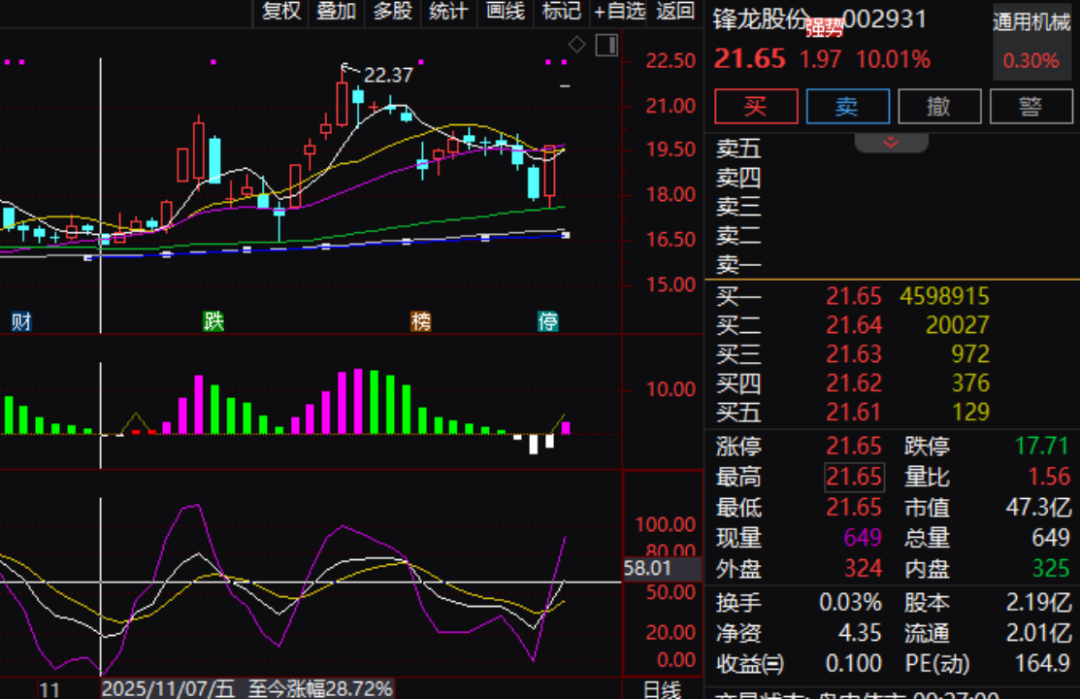 锋龙股份(002931)今日复牌后一字涨停,开盘涨停板封单量达459.89万手,两倍于流通盘,之后封单量有所减少。